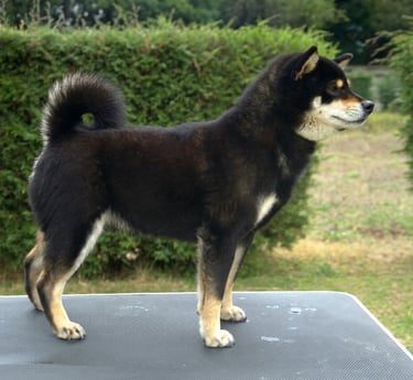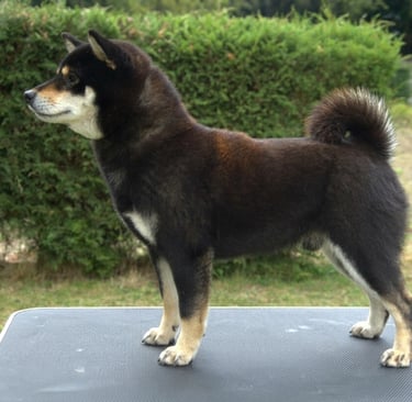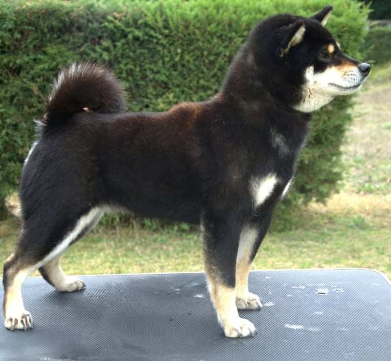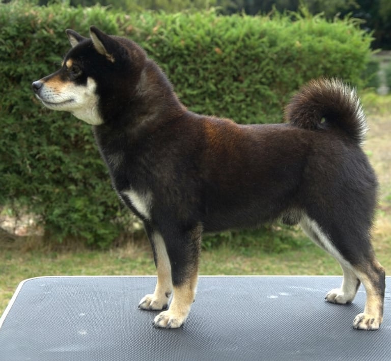 Presenta un cuerpo compacto, sólido y bien proporcionado, con una línea superior firme y estable, que le otorga una silueta poderosa y bien estructurada. Su cola de inserción alta, correctamente enroscada y bien poblada, refuerza su tipicidad y aporta balance al conjunto.
