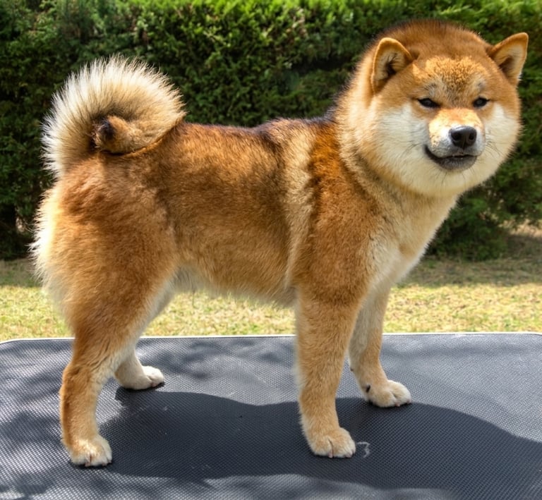 El manto presenta una rica tonalidad roja intensa, con sombreados que aportan profundidad, acompañado de un Urajiro limpio y bien definido, resaltando aún más su expresión y marcando correctamente los contrastes característicos del Shiba Inu.