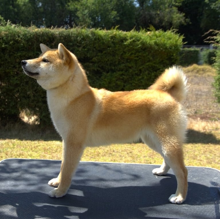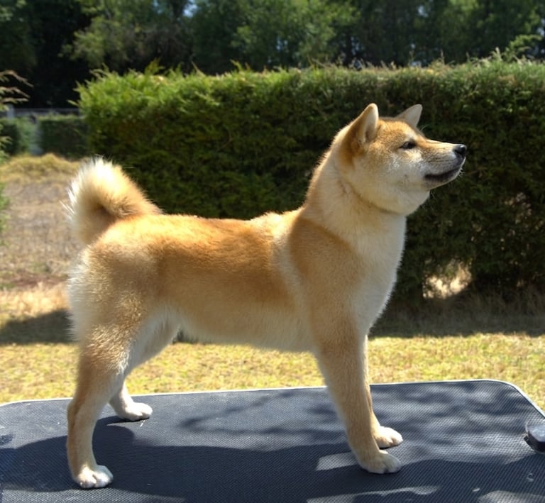 Su cabeza muestra buen carácter racial, con hocico firme y bien proporcionado, labios ajustados y una expresión vivaz, característica del Shiba, que transmite atención y seguridad.