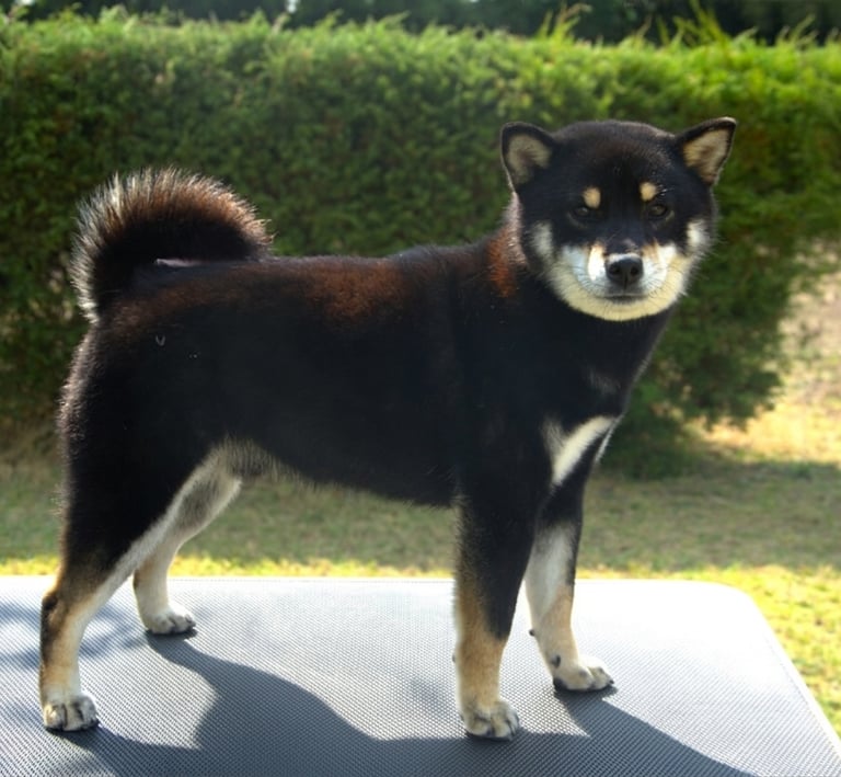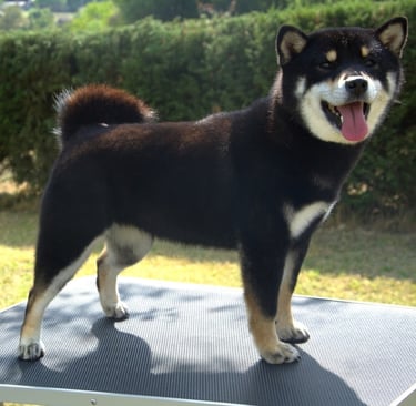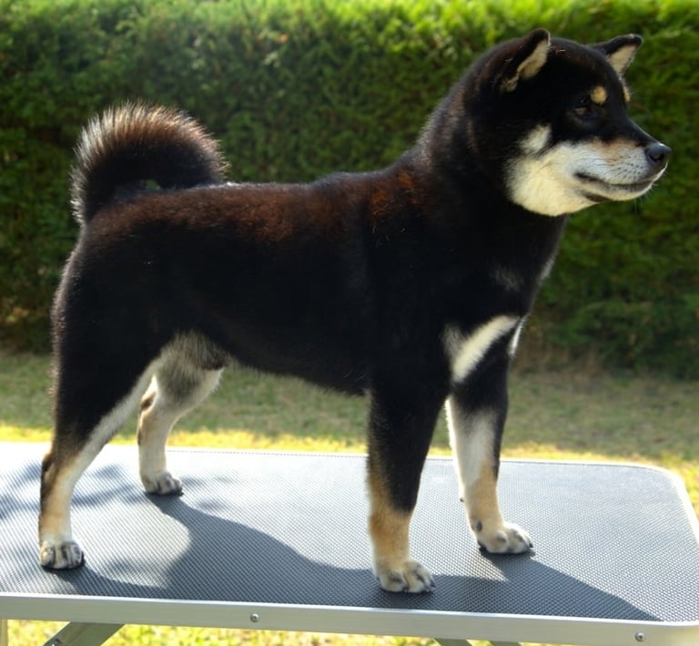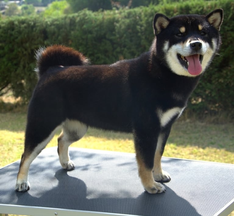 El manto negro es profundo y uniforme, con marcas fuego bien definidas y un Urajiro limpio y contrastante, lo que resalta su expresión y le da una apariencia muy atractiva y típica dentro de la raza.